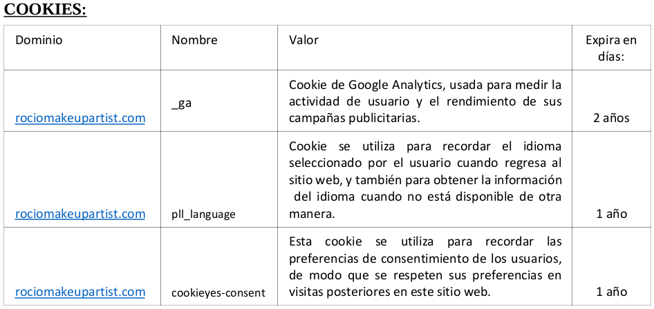 Datos de contacto para ejercer sus derechos: Rocío Make Up Artist, calle Olmo n˚20, Las Eras (Alcalá del Júcar) – Albacete 02210, o mediante el envío de un correo electrónico, dirigiéndose a: rocio.ro.80@gmail.com.